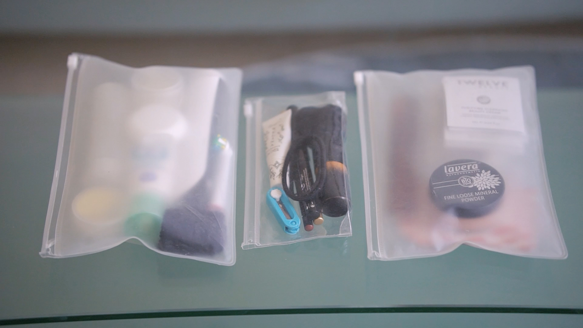 Simple travel containers from MUJI, in sizes from standard to super tiny ones like the size of a thumb, work well for tiny bags.