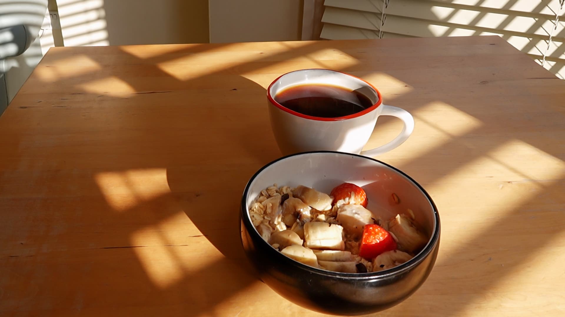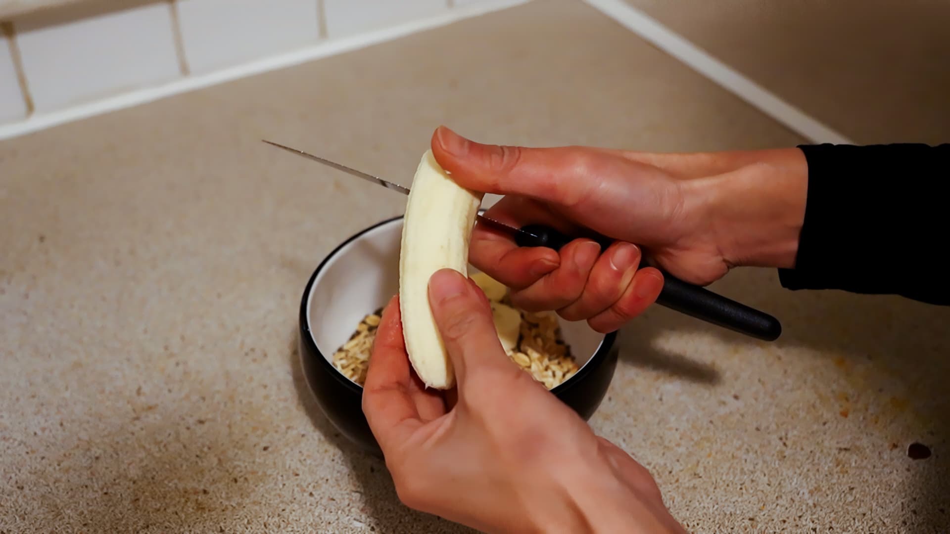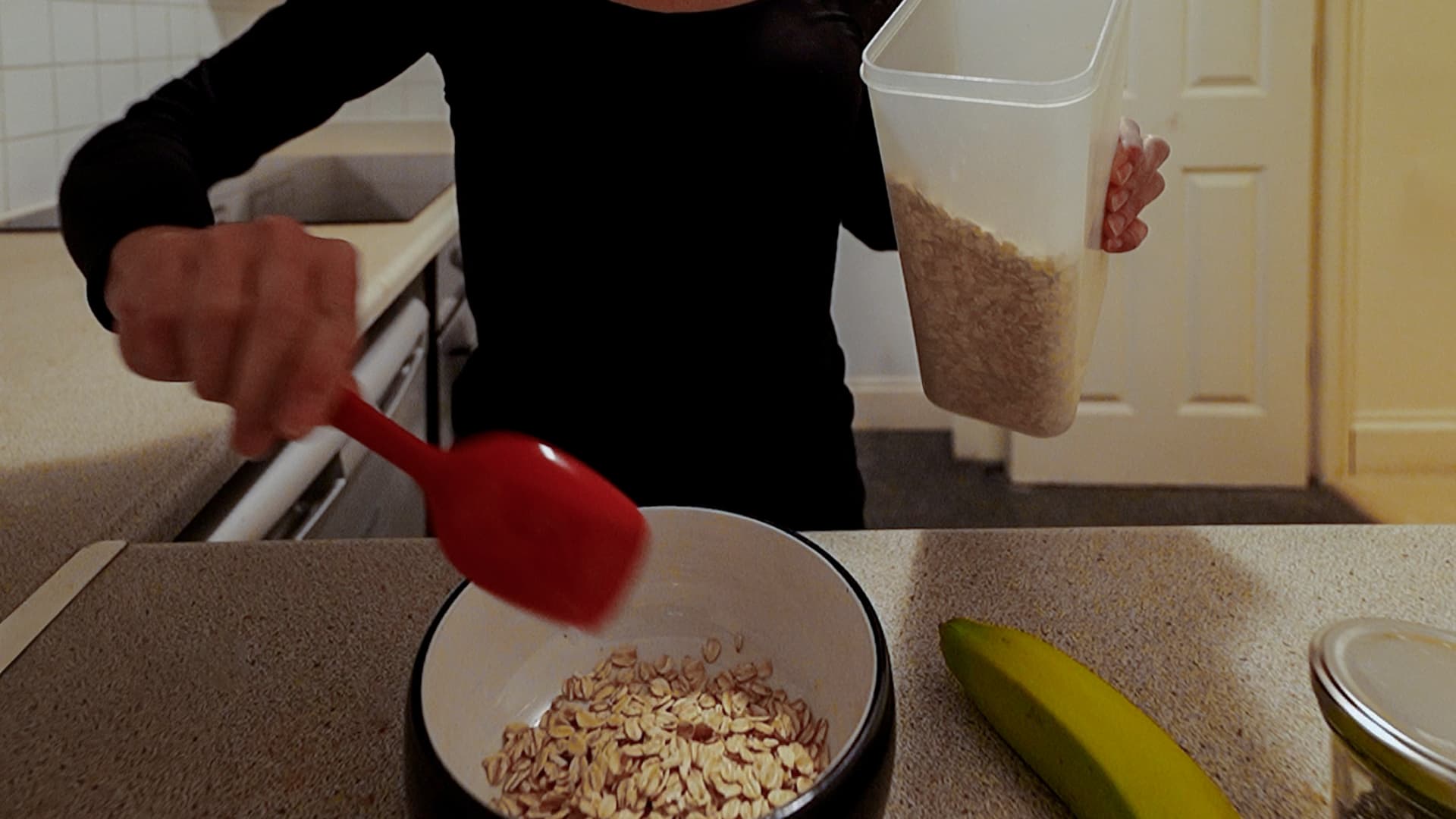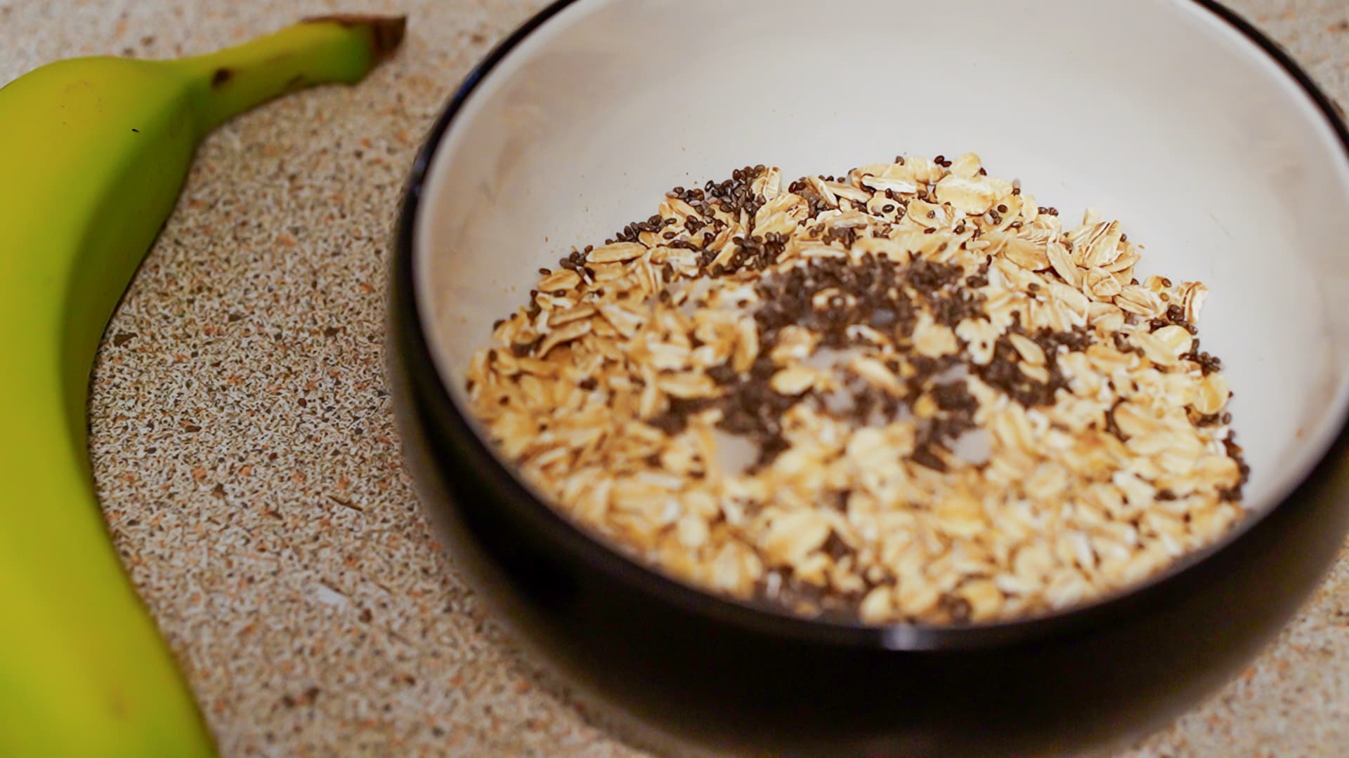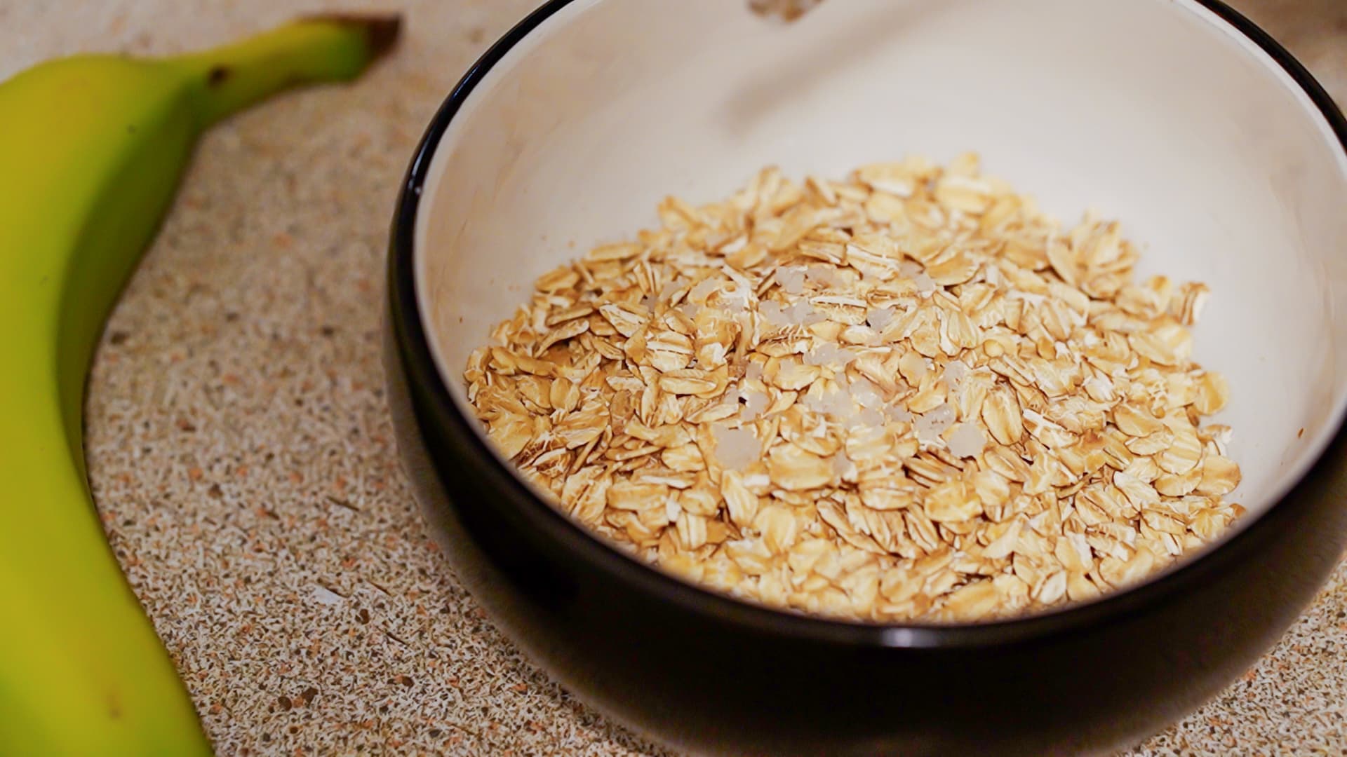 1: Add 5-7 spoons of oats into a breakfast bowl.